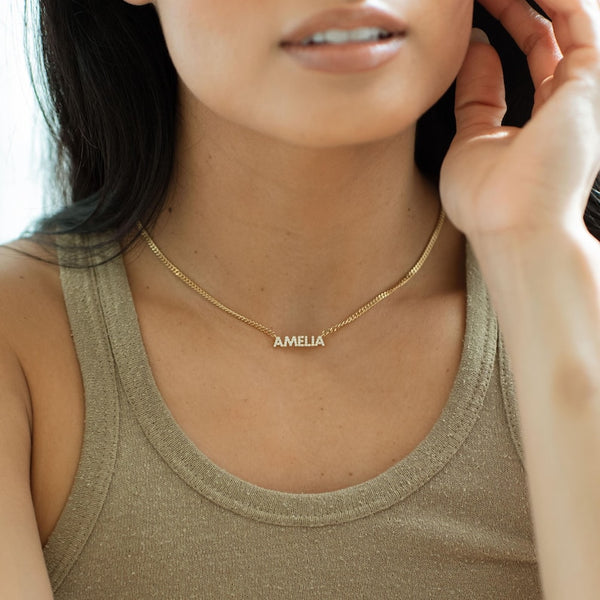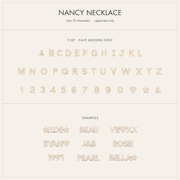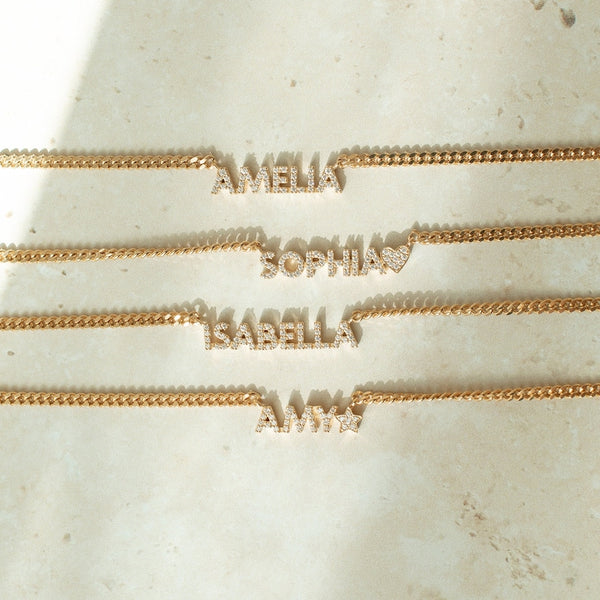 Stand out with our dazzling Nancy Necklace, featuring your name or the name of a loved one, studded with glistening cubic zirconia stones, along a bold curb chain. Add a pavé heart, star, or & symbol for extra charm. It’s a heartfelt gift for any occasion, from engagements and anniversaries, to birthdays or holiday gatherings. This meaningful piece can be layered with other jewelry, or can shine on its own.