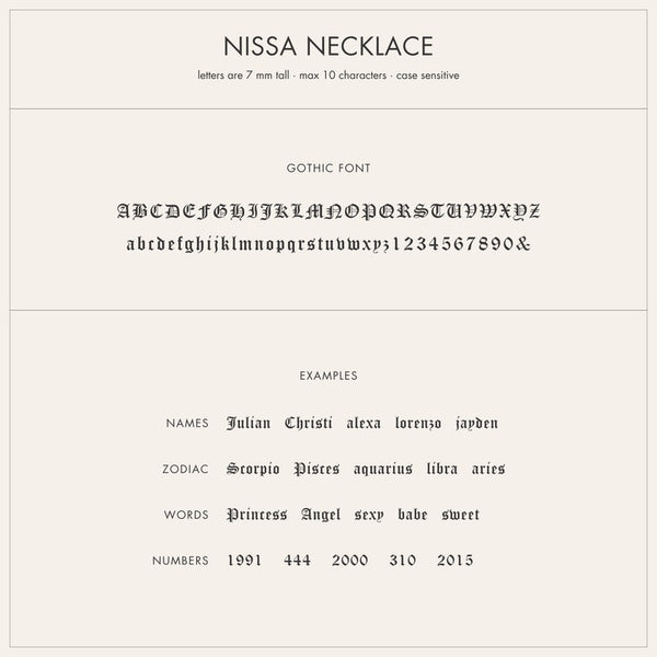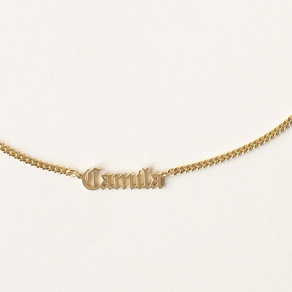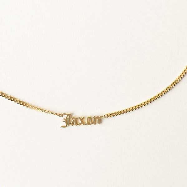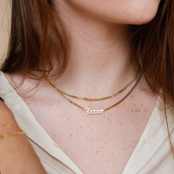 Our Nissa Necklace features your name or the name of a loved one in gothic letters, along a bold curb chain. The edgy yet subtle design makes this a perfect piece to wear on its own or layered with other pieces, and is a perfect gift for any occasion, from engagements and anniversaries, to birthdays or holiday gatherings.
