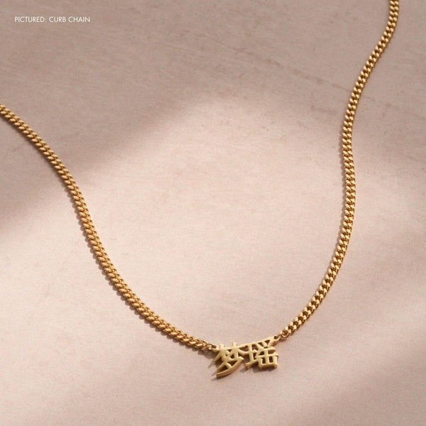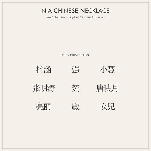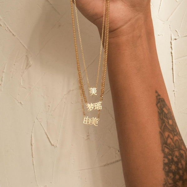 Celebrate your Chinese heritage with our custom Nia Chinese Necklace. The beautifully crafted nameplate, which displays up to three Chinese characters, makes for a unique and elegant piece of jewelry, perfect for everyday wear. Simplified and traditional Chinese characters can be displayed with this necklace. It’s sure to be a treasured keepsake piece for your kids, your best friend, your mother, or yourself!