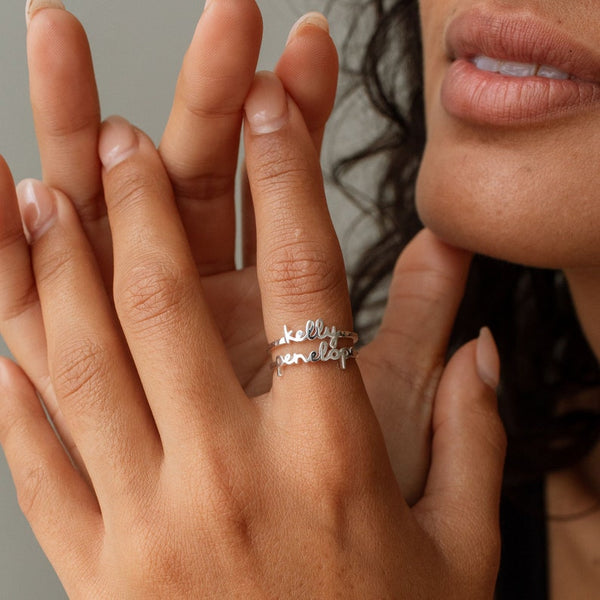 Let your name shine brilliantly with our custom Sabena Name Ring, featuring dainty handwritten letters. It’s a perfect heartfelt gift for any occasion, from engagements and anniversaries, to birthdays or holiday gatherings. Show off the names of your children or partner with this beautiful keepsake piece that will be cherished for years to come.